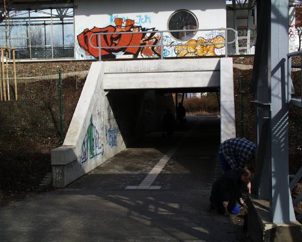 Der Fußgängerverkehr unter der EÜ war während der Bauphase aufrecht zu erhalten. Hierfür ist als Bauzustand ein bestehender Bahnsteigzugang neben der EÜ zur zweiten Seite geöffnet worden. Der provisorische Bahnsteigzugang ist nach der Baumaßnahme in den Bestand übernommen worden.