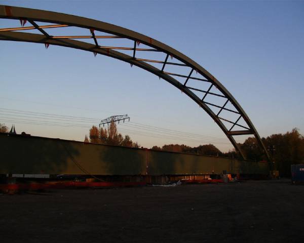 Der Hauptträger mit h=3,00 m wird an den Bögen hxb=0,80 x0,80 m aufgehängt. Der Bogen steht also auch ohne die Hänger.